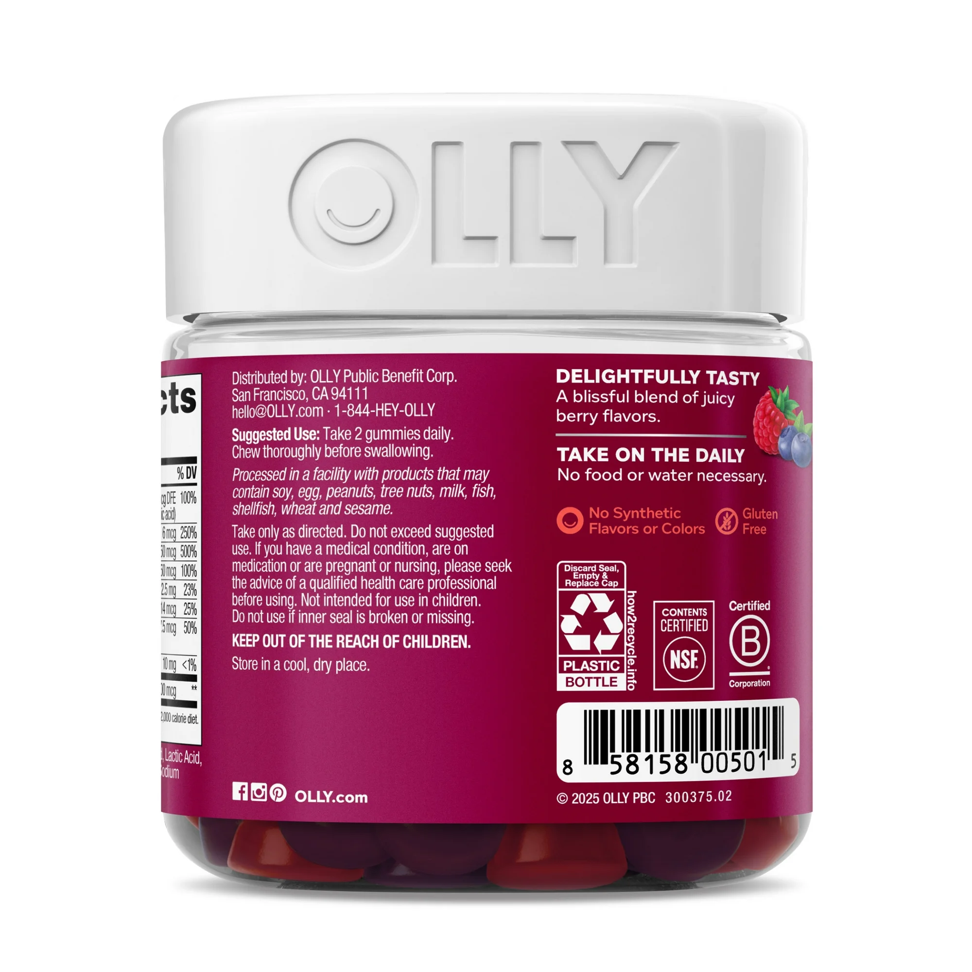 - OLLY Women’s Multivitamin Gummy, Vitamins A, D, C, E, Biotin, Berry Flavored, 90 Ct